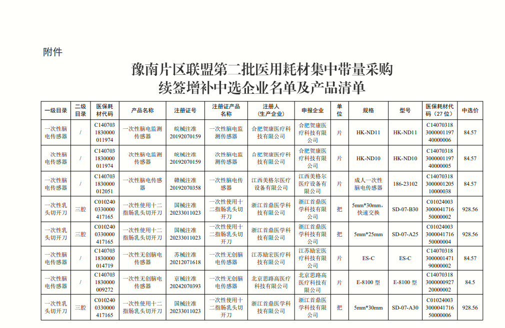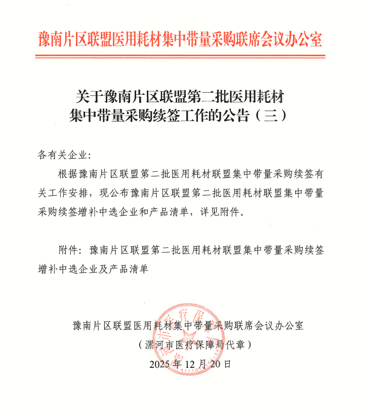 關(guān)于豫南片區(qū)聯(lián)盟第二批醫(yī)用耗材集中帶量采購續(xù)簽工作的公告(三)