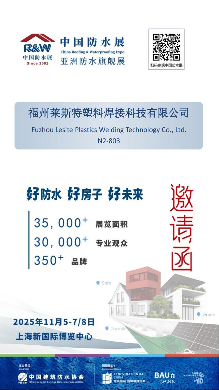 于萊斯特而言,此次參展不僅是技術(shù)與產(chǎn)品的亮相,更是對(duì)品質(zhì)的堅(jiān)守、對(duì)責(zé)任的擔(dān)當(dāng)。2025 年 11 月 5-7 日,讓我們相約黃浦江畔,于上海新國(guó)際博覽中心 N2 館 803 展位相聚!在這里,您可輕觸防水科技的最新脈搏,感受行業(yè)智慧的匯聚之力;在這里,我們將攜手探索建筑防護(hù)的無(wú)限可能,以匠心與創(chuàng)新,共同書(shū)寫(xiě)防水行業(yè)的嶄新篇章。