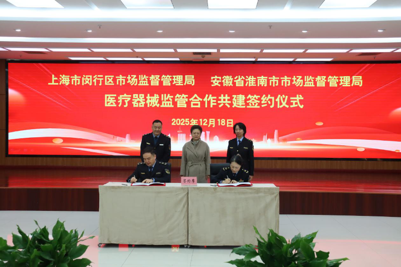 ??? 為深入貫徹落實(shí)長(zhǎng)三角一體化發(fā)展國(guó)家戰(zhàn)略,推動(dòng)區(qū)域醫(yī)療器械監(jiān)管體系與監(jiān)管能力現(xiàn)代化,促進(jìn)產(chǎn)業(yè)高質(zhì)量發(fā)展,12月18日,上海市閔行區(qū)市場(chǎng)監(jiān)管局與安徽省淮南市市場(chǎng)監(jiān)管局在淮正式簽署《醫(yī)療器械監(jiān)管協(xié)作共建協(xié)議》?;茨鲜腥嗣裾泵貢L(zhǎng)楊倩,上海市閔行區(qū)市場(chǎng)監(jiān)管局黨組書記、局長(zhǎng)顧瓊,淮南市市場(chǎng)監(jiān)管局黨組書記、局長(zhǎng)李寶云,上海市市場(chǎng)監(jiān)管局執(zhí)法總隊(duì)三級(jí)高級(jí)主辦謝潔等參加活動(dòng)。淮南市市場(chǎng)監(jiān)管局黨組成員、副局長(zhǎng)陳海峰主持儀式。此舉標(biāo)志著兩地市場(chǎng)監(jiān)管部門在醫(yī)療器械專業(yè)監(jiān)管領(lǐng)域的合作邁入制度化、常態(tài)化的新階段,持續(xù)探索長(zhǎng)三角藥品監(jiān)管一體化區(qū)域協(xié)作的新路徑。